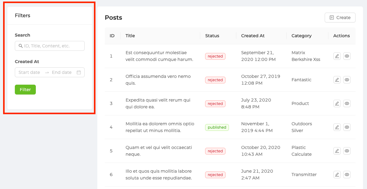We can make extensive search / filter operations using the useTable hook on the listing pages.